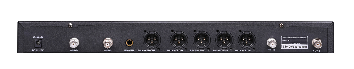 UHF Four-Channel series; True diversity circuit with double-tuned (working range up to 160 meters); digital pilot decoding&Muting circuit to ensure receiving the signal of the matching microphone; Infrared frequency; Phase-locked loop providing 200 frequency; The high-definition, high fidelity, wide dynamic range & audio frequency response range etc; Suitable for professional large indoor and outdoor performance.
